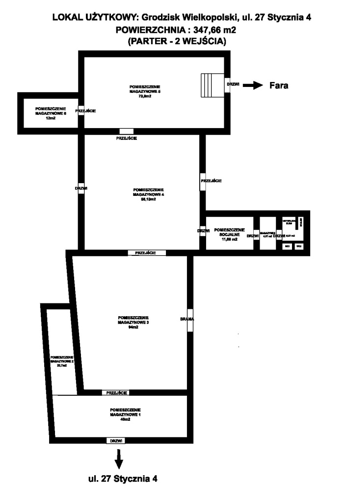 Oferuję lokal na wynajem o powierzchni 347 m² (nie wliczając garażu – garaż ok. 90m2). Istnieje możliwość wynajmu części lokalu – od strony Fary znajduje się dodatkowe, osobne wejście).
