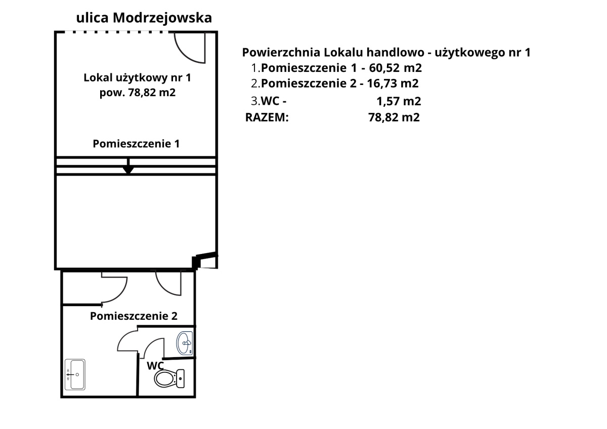 Lokal składa się z : Pomieszczenie nr 1 (Sala sprzedaży) – 60,52 mkw., Pomieszczenie nr 2 (Zaplecze) – 16,73 mkw., WC – 1,57 mkw.