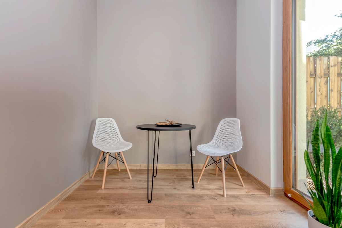 Znajduje się na parterze kameralnego budynku jednorodzinnego. Posiada samodzielne wejście z zewnątrz. Wielkość 25m² mieści salon z otwartą kuchnią, łazienkę oraz aneks sypialniany (łóżko do uzgodnienia). Do dyspozycji najemcy jest otoczony zielenią ogród. Całość wykończona z dbałością o szczegóły.
